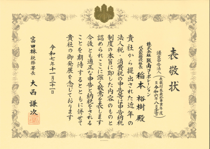 令和7年11月21日、弊社は富田林税務署より「優良申告法人」として表敬を受けました。